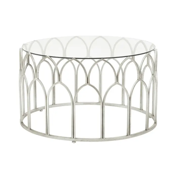 The table’s frame is made from iron, with a silver finish that makes it easy to style with reflective metallic accessories. Arranged into a double layer of arcing motifs, the round frame is inspired by minaret architecture.