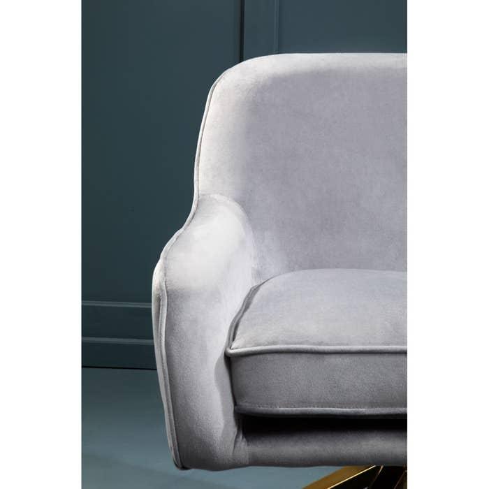 The Avery chair features a curved backseat and flared armrests with a foam padded seat upholstered in sumptuous grey velvet. The luxurious seat is supported by a gold finish cross-base which adds style with support.