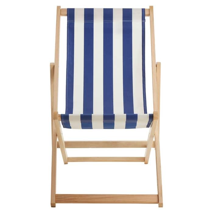 This folding deckchair has white and navy striped weather-resistant sling that gently reclines to support head and neck.