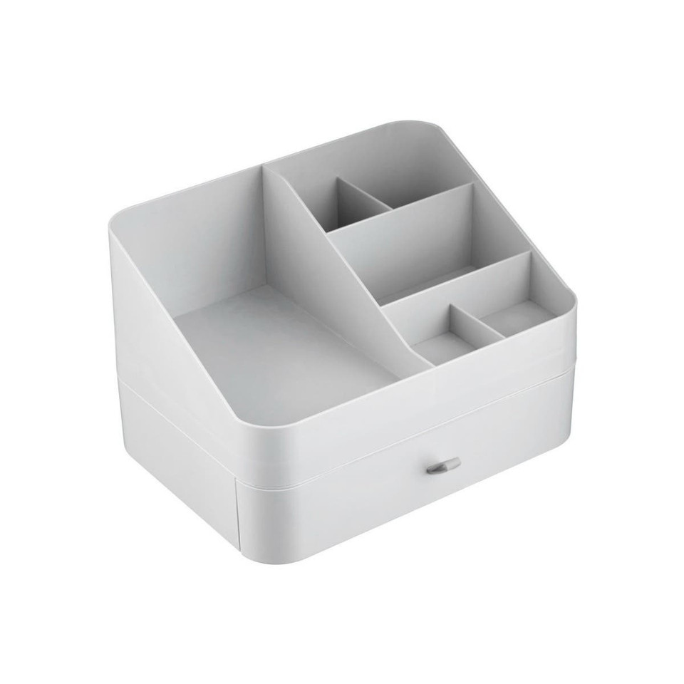 Boasting an elegant design in a white finish with grey handle, this cosmetics organiser has one pull-out drawer for storing items. Made from sturdy plastic, the six compartments of this box-shaped organiser store a wide array of makeup products.