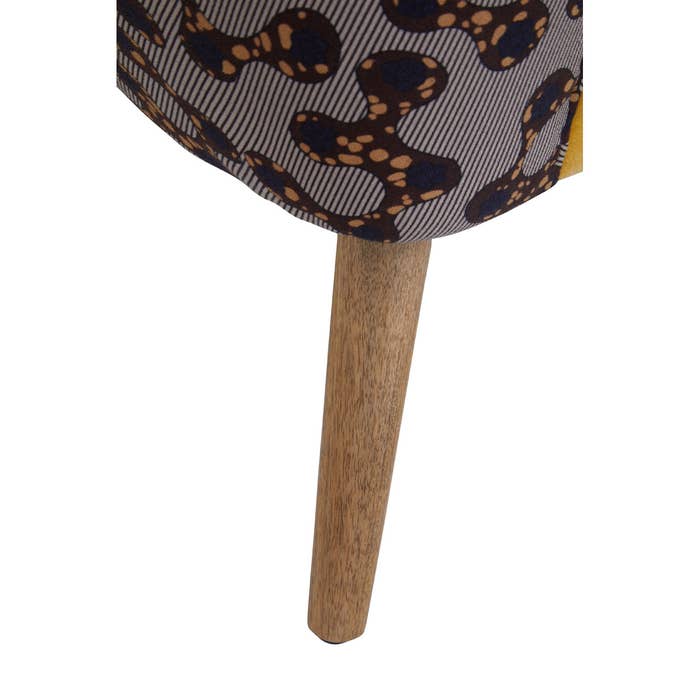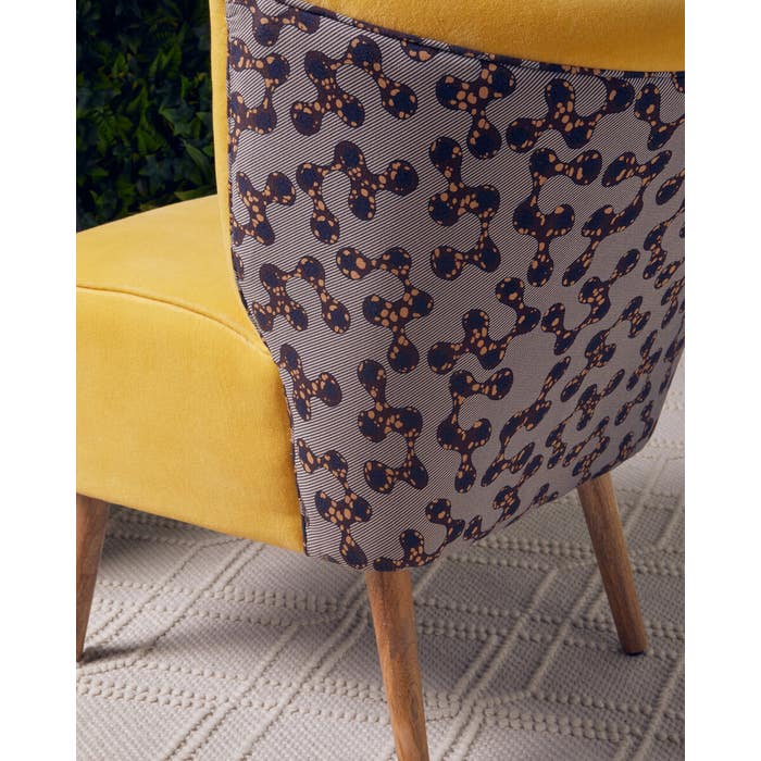 The Cefena yellow chair is contrasted by a stylish print design on the back and supported by mango wood legs.