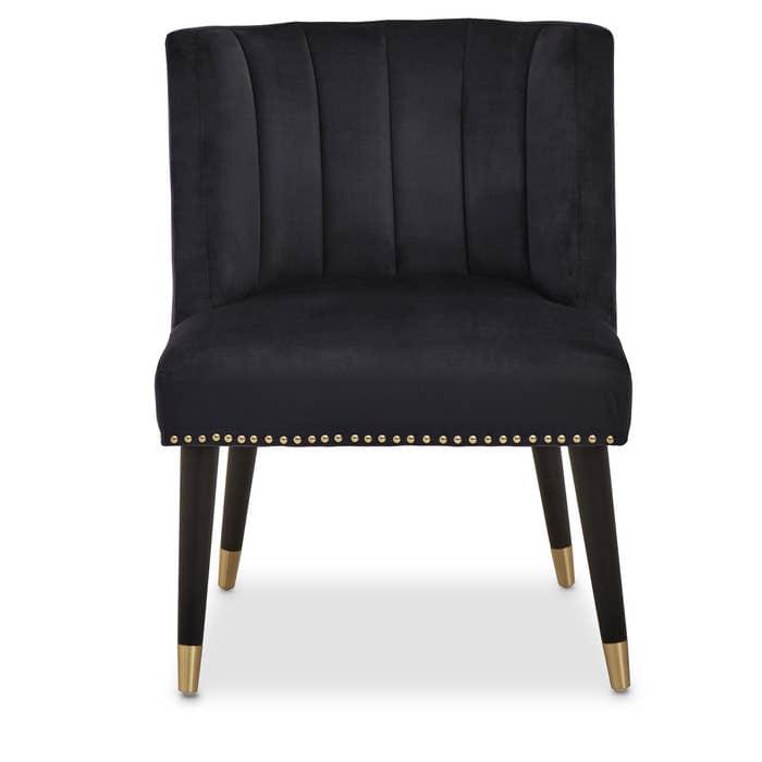 Covered in black velvet, this chair with a thick foam padded seat is complemented by a curved back with vertical channel tufting. The black rubberwood angular legs with gold finish tips add hints of glamour to the midcentury modern design.