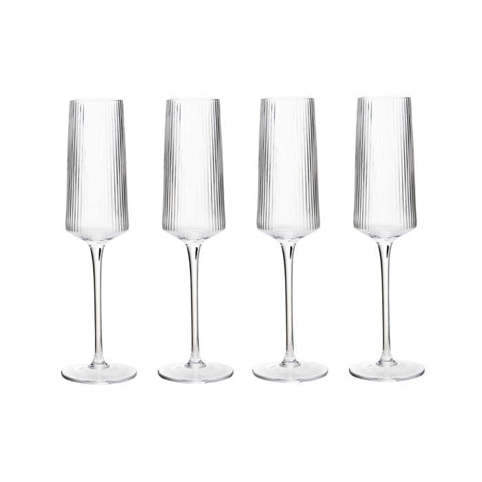 The Eldon set of four champagne glasses have an eye-catching ribbed effect and slender stem, this set will be a distinctive addition to your glassware.