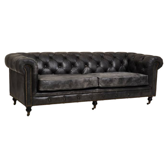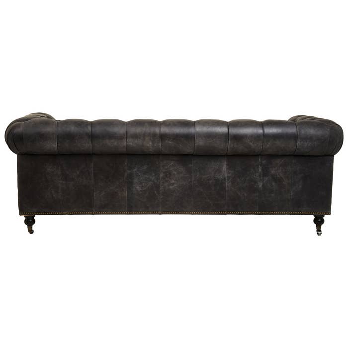 Upholstered in ebony leather, this three seat sofa in deep buttoning creates a traditional chesterfield aesthetic. The foam filled seat and back cushions provide premium comfort. Rolled arms and turned feet with castor wheels contribute to vintage look.