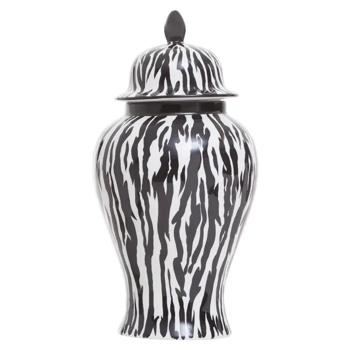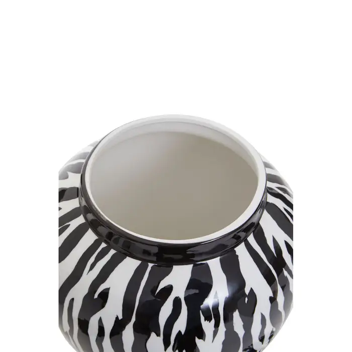 This large ceramic vase stands out with an elegant urn shape in a smooth glazed finish. An abstract black and white pattern adorns the curved design topped with a removable lid and a decorative finial handle contributing to classic elegance.