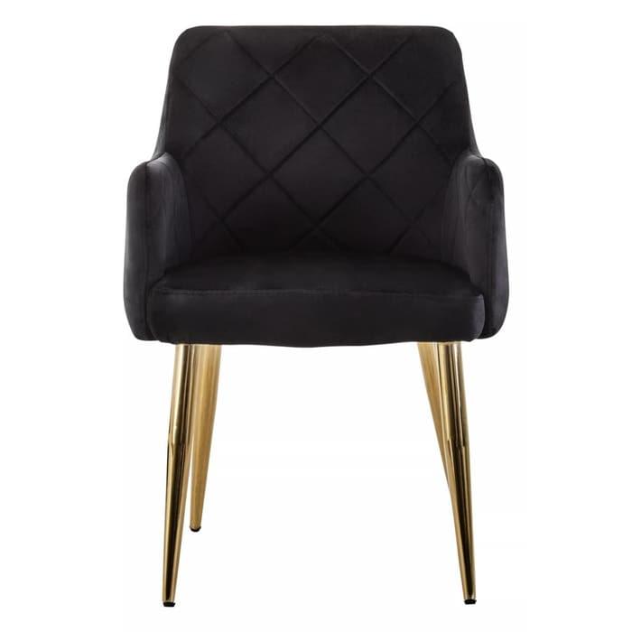 This chair features black velvet upholstery on the padded seat, back and cocooning armrests. A quilted pattern on the back adds texture and detail to the design, complete with sleek splayed metal legs in a gold finish which elevate modern sophistication.