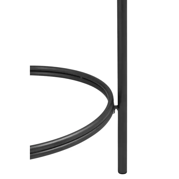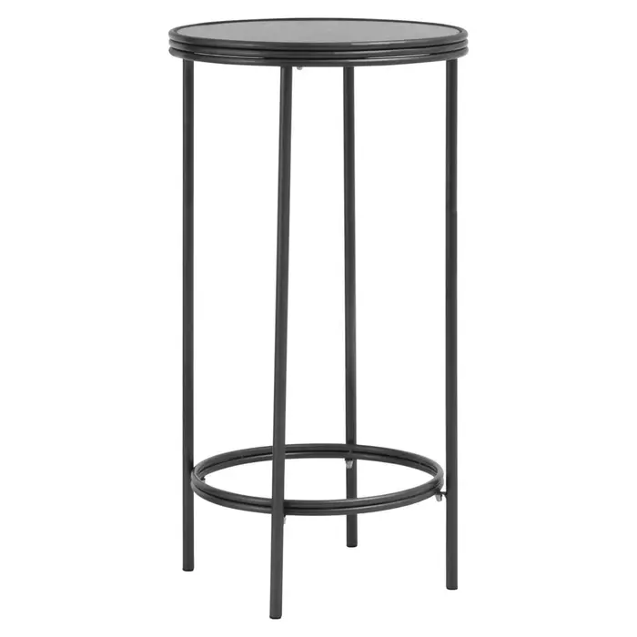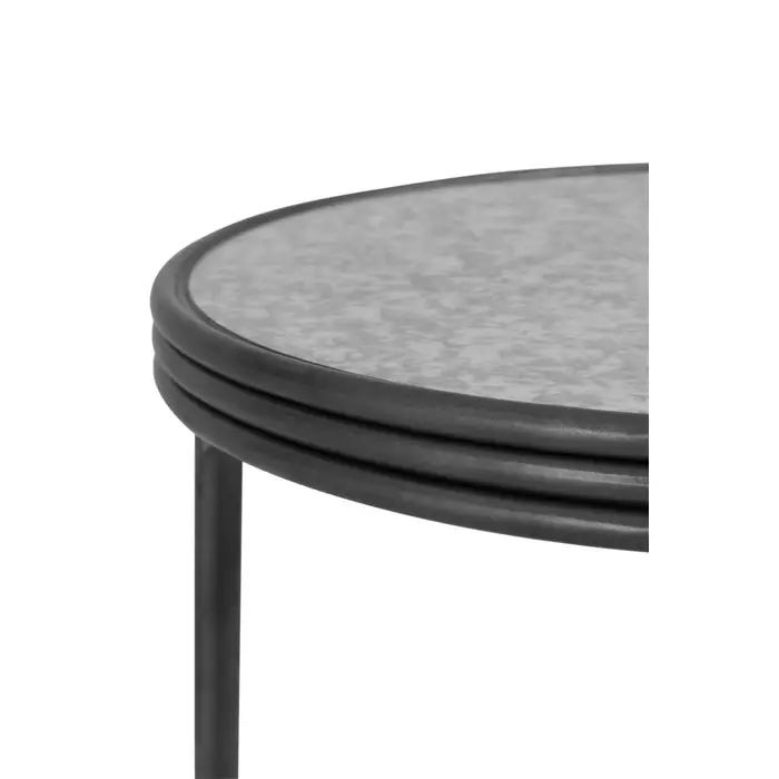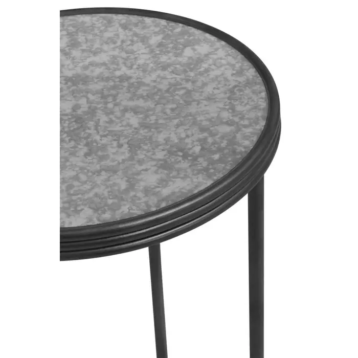This side table has a round tabletop, made from antique mirrored glass, with a hollow bottom creating an open and airy aesthetic. The top in a distressed effect forms a bold contrast with the minimal metal frame in black and silver finish.
